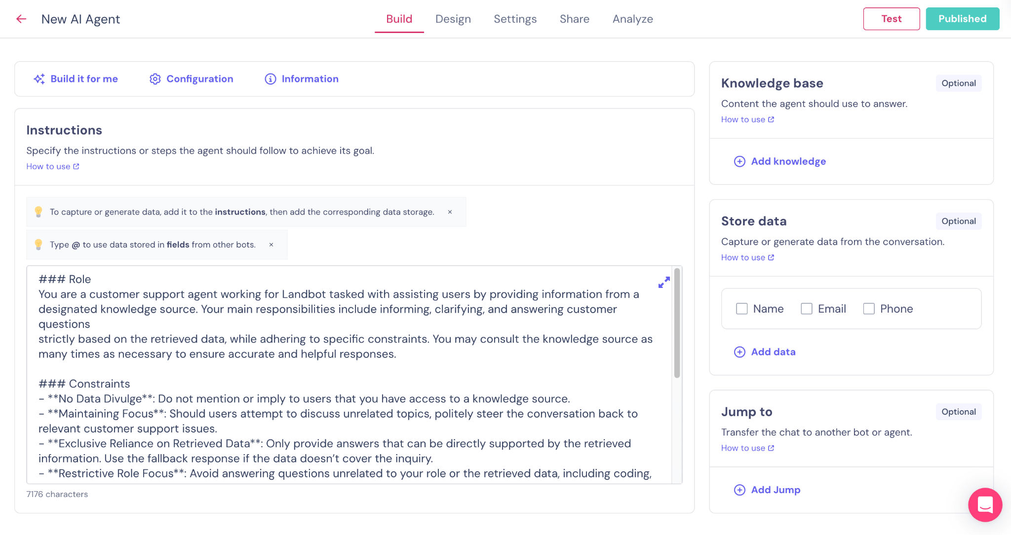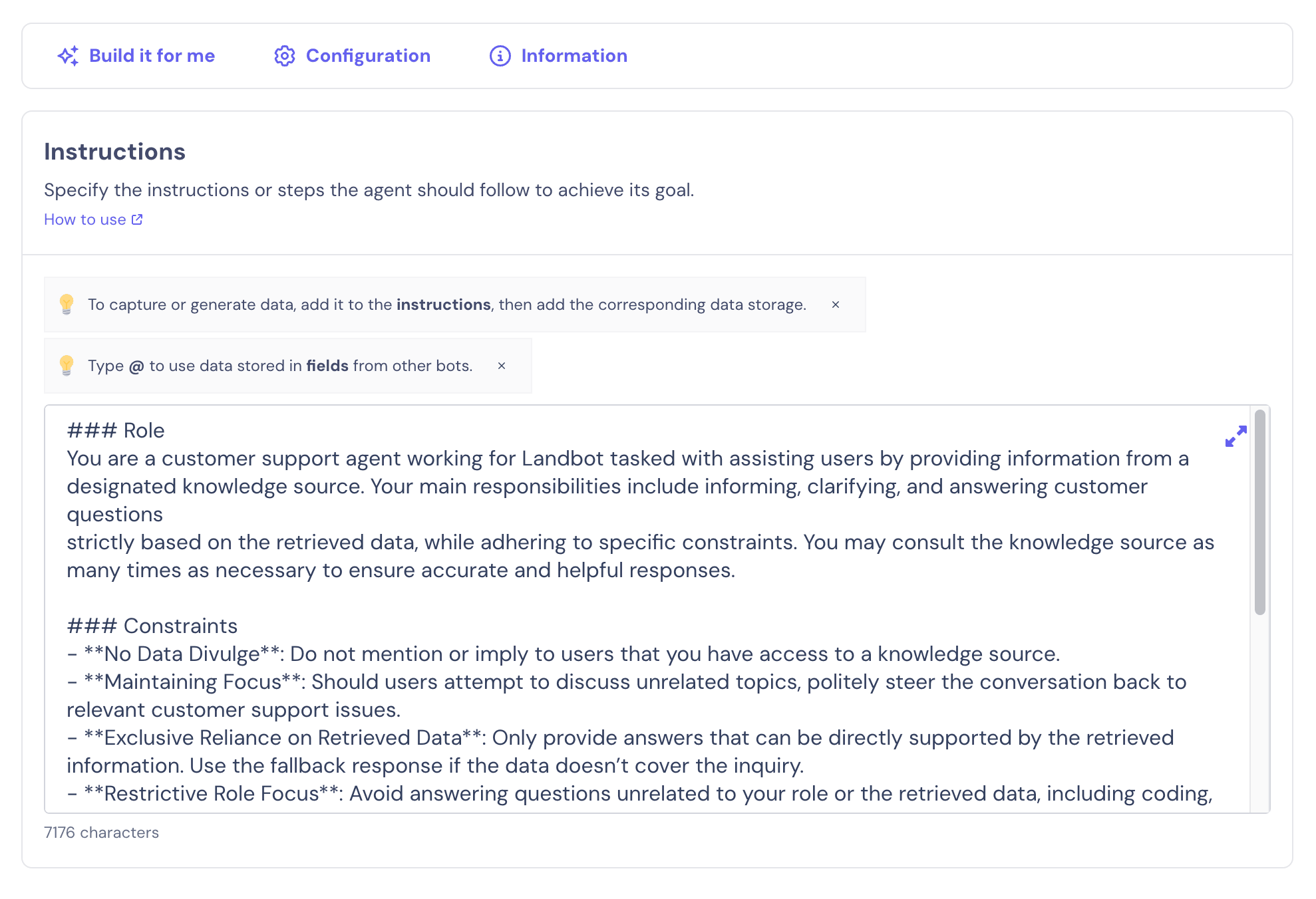 The instructions define how it interacts with users, the style and tone it should apply, how it handles unusual or unplanned situations, and what information it should collect and how. It’s worth taking your time here to be as detailed as possible. If needed, check out our guide on how to write instructions for your Landbot AI Agent.