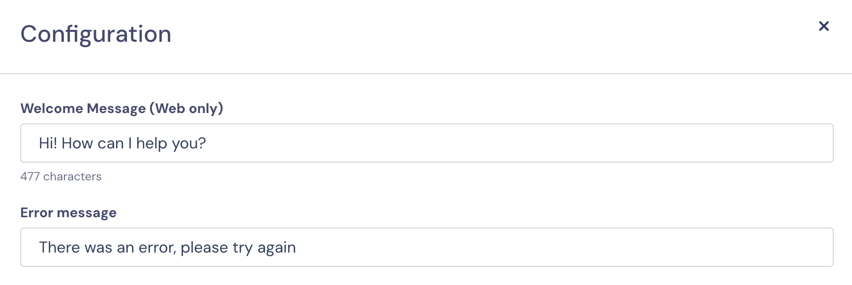 Additionally, in the “Configuration” section at the top, you can add a welcome message and a customer error message, which will be triggered if there’s a technical issue with your Agent.