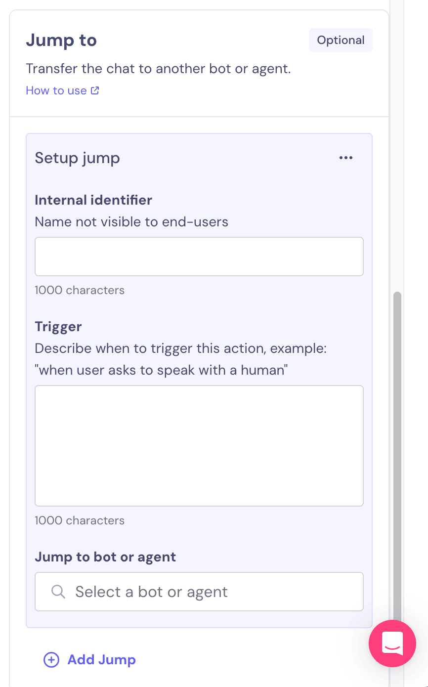 This is optional, but it’s an important step to prevent users from getting stuck in a conversational loop with your AI Agent. Click on “Add jump”, then give that jump a name, define the instructions, and select the next step if you want to connect the AI Agent to another bot.